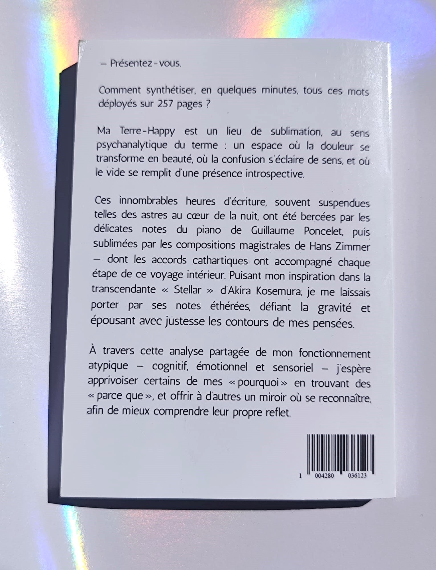 Ma Terre-Happy est un voyage introspectif qui explore toutes les facettes de l’hypersensibilité, la quête de sens et les paradoxes d’un esprit toujours en mouvement.